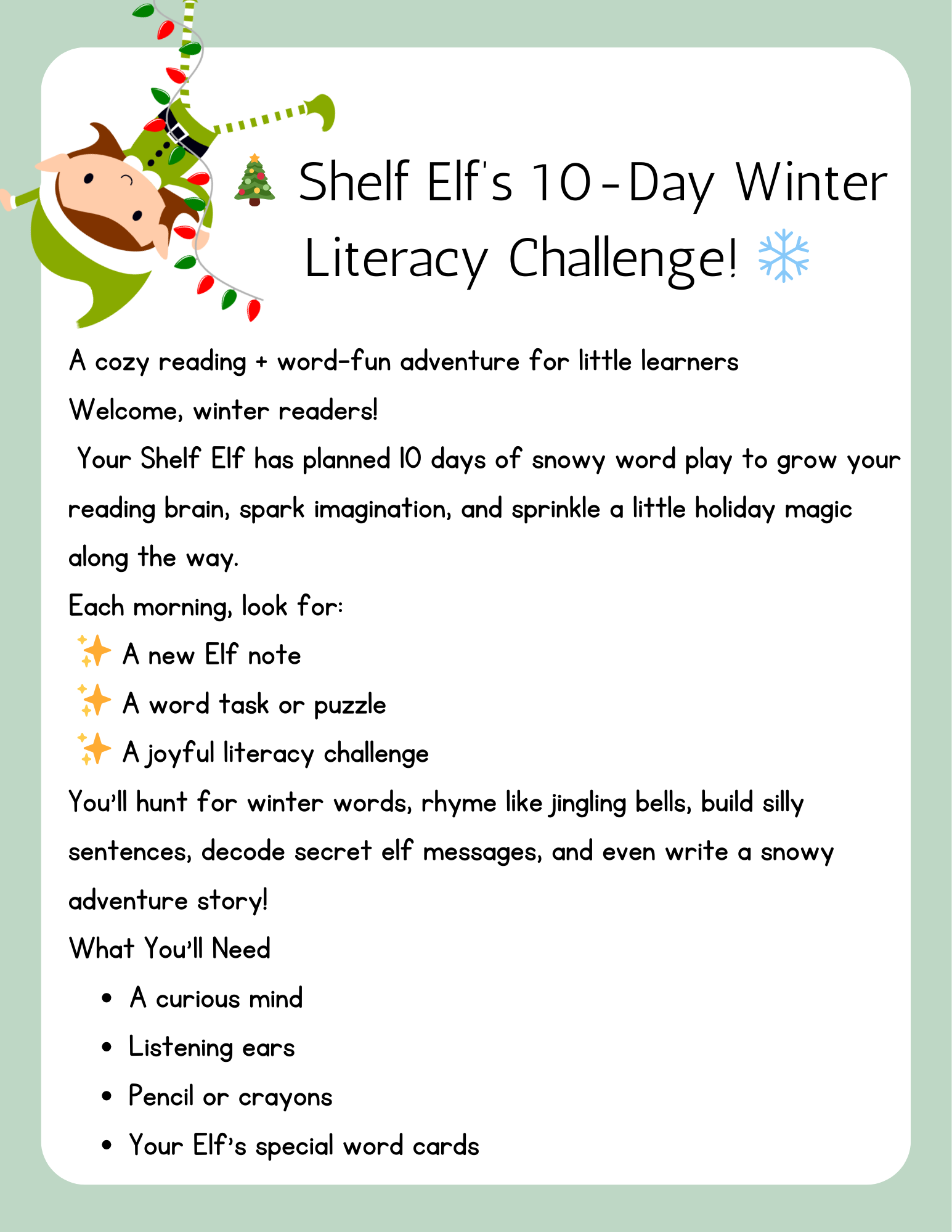 Shelf Elf Literacy Challenge 10 Days. 10 Activities. Endless Reading Fun! Does your classroom have a Shelf Elf? Then this mini literacy challenge is for you! Your elf will guide students through five quick, joyful literacy tasks designed to boost phonics, vocabulary, and sentence skills—all wrapped in holiday magic. Each day brings a new surprise from your elf: word play, decoding games, silly sentences, and creative challenges that keep learning light and engaging. Perfect for busy December classrooms, this challenge requires minimal prep, delivers maximum smiles, and reinforces foundational reading skills in a fun, festive way. Let your Shelf Elf spark curiosity, joy, and literacy growth this week!